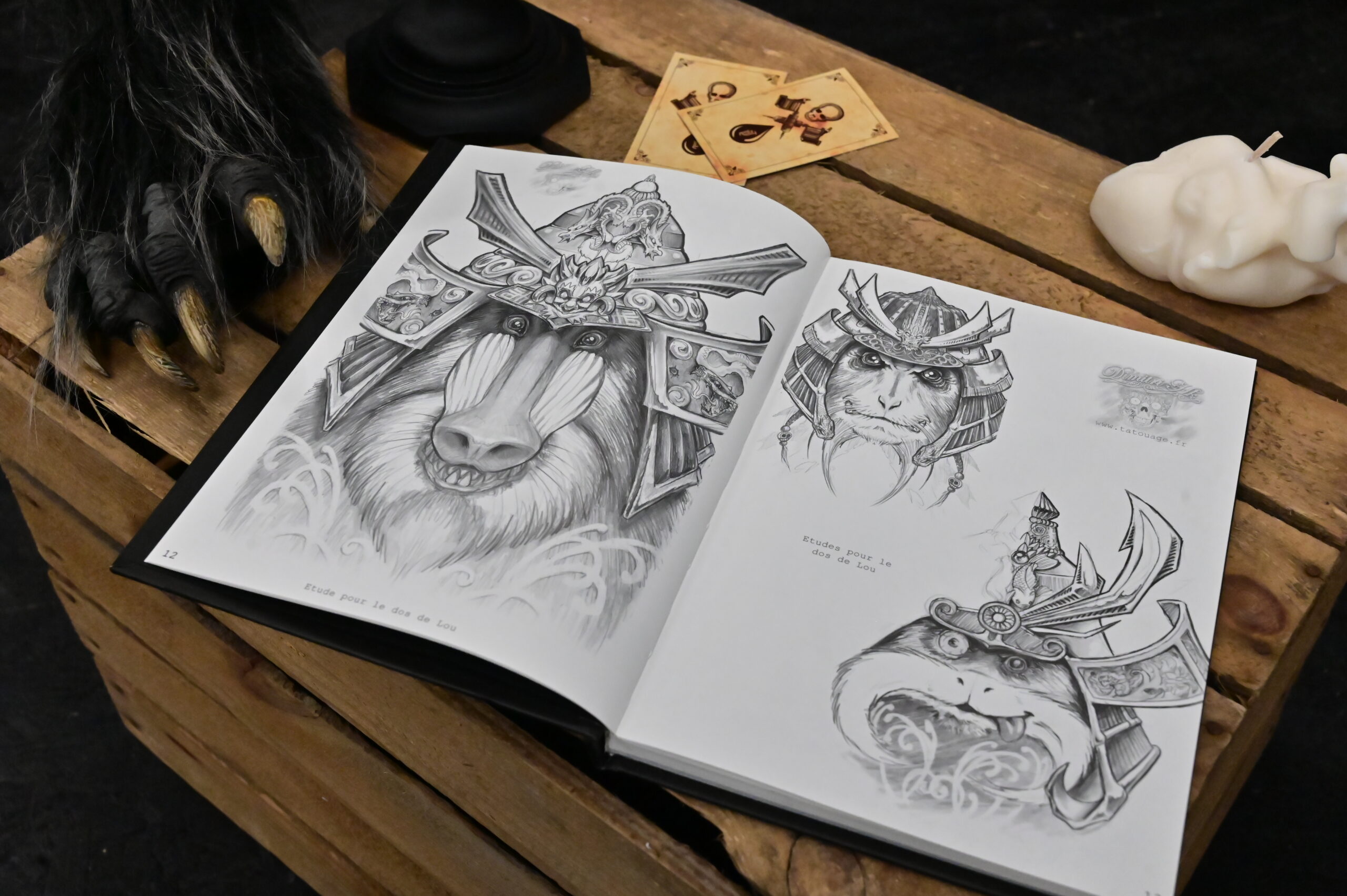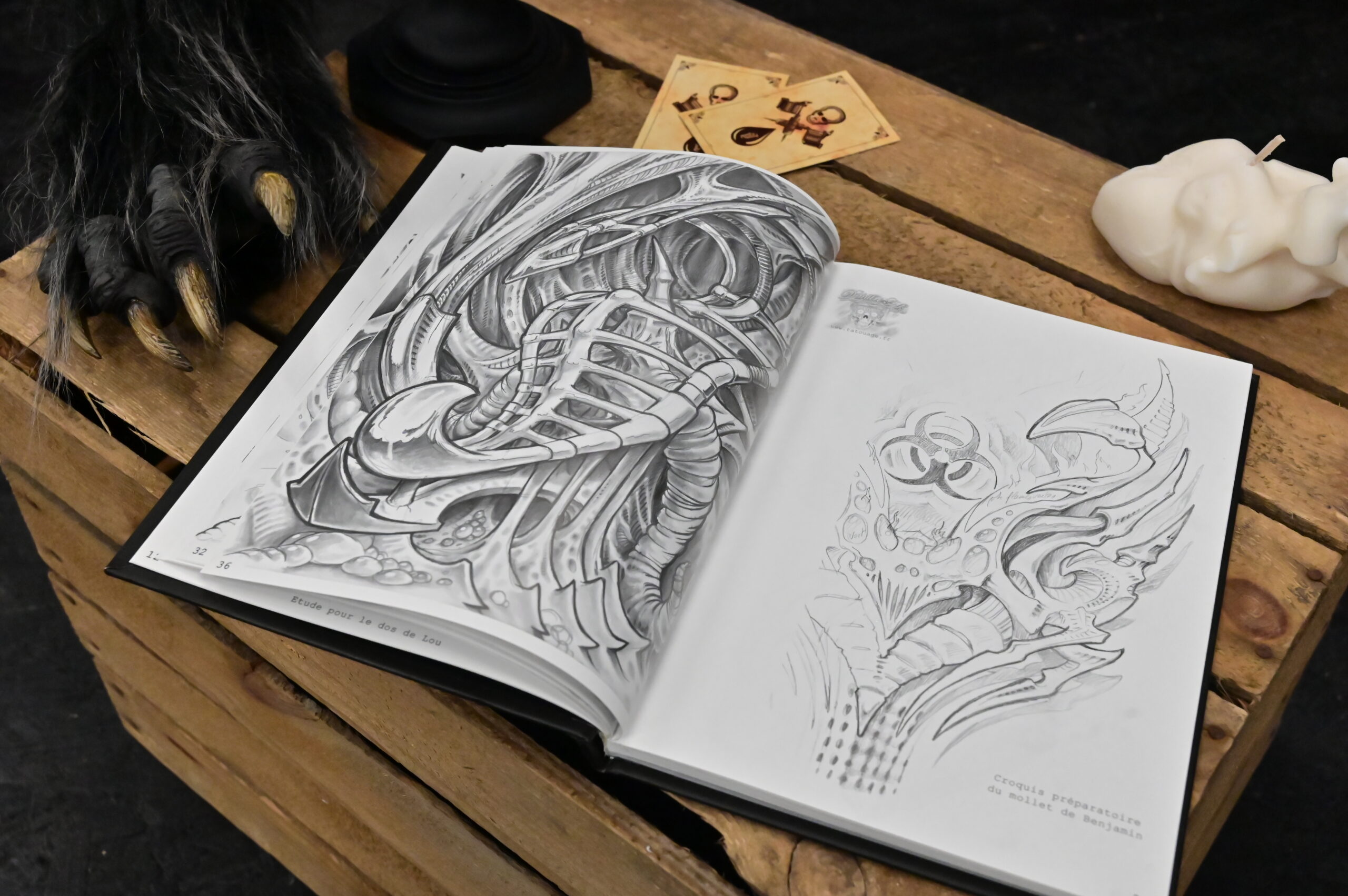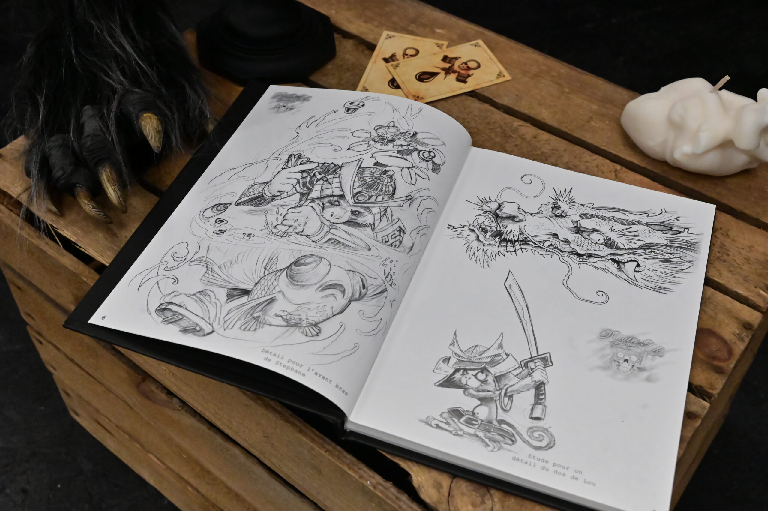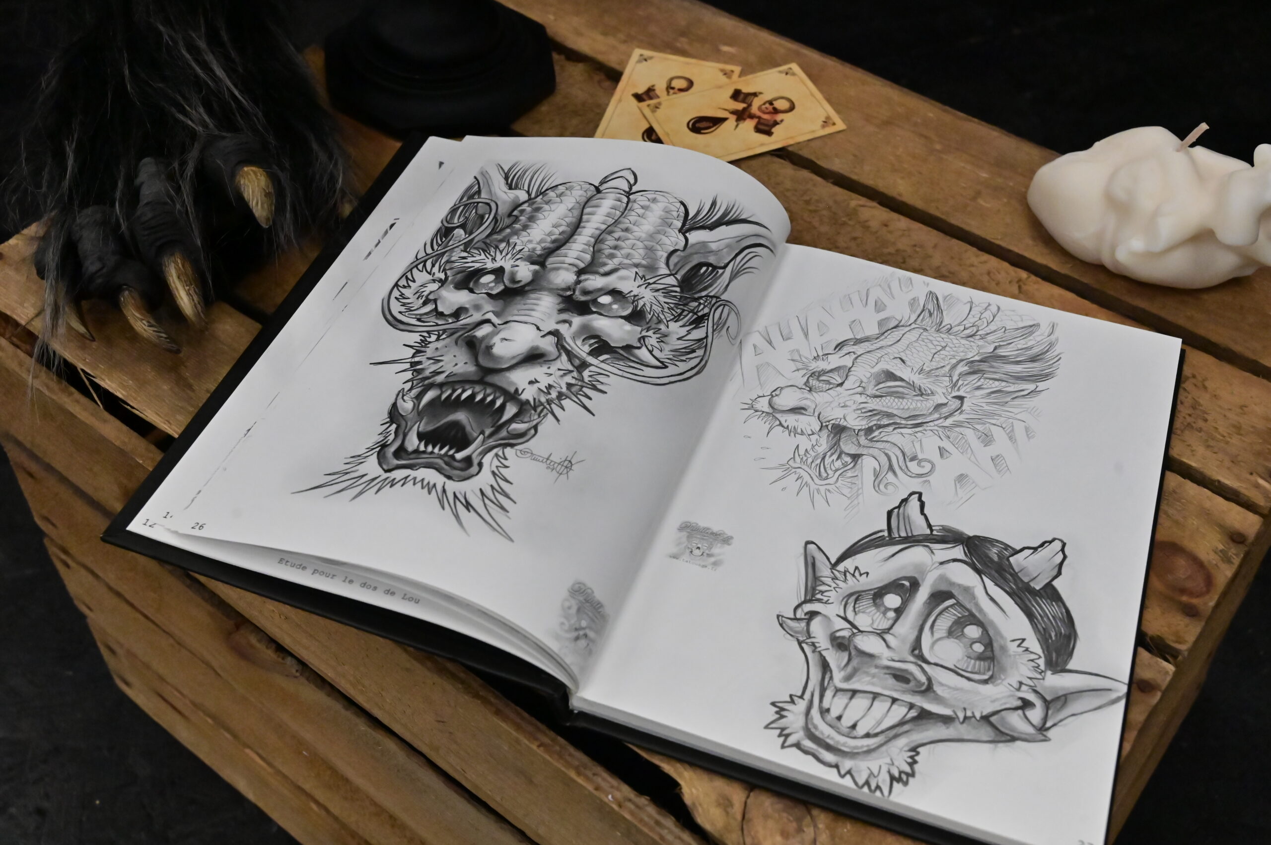 47.39Une sélection d’oeuvres de tatouage, des dessins et des photographies du travail terminé.