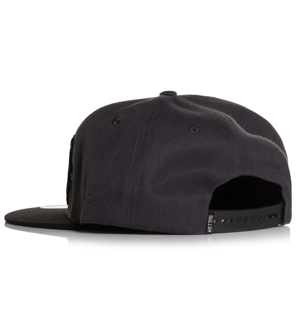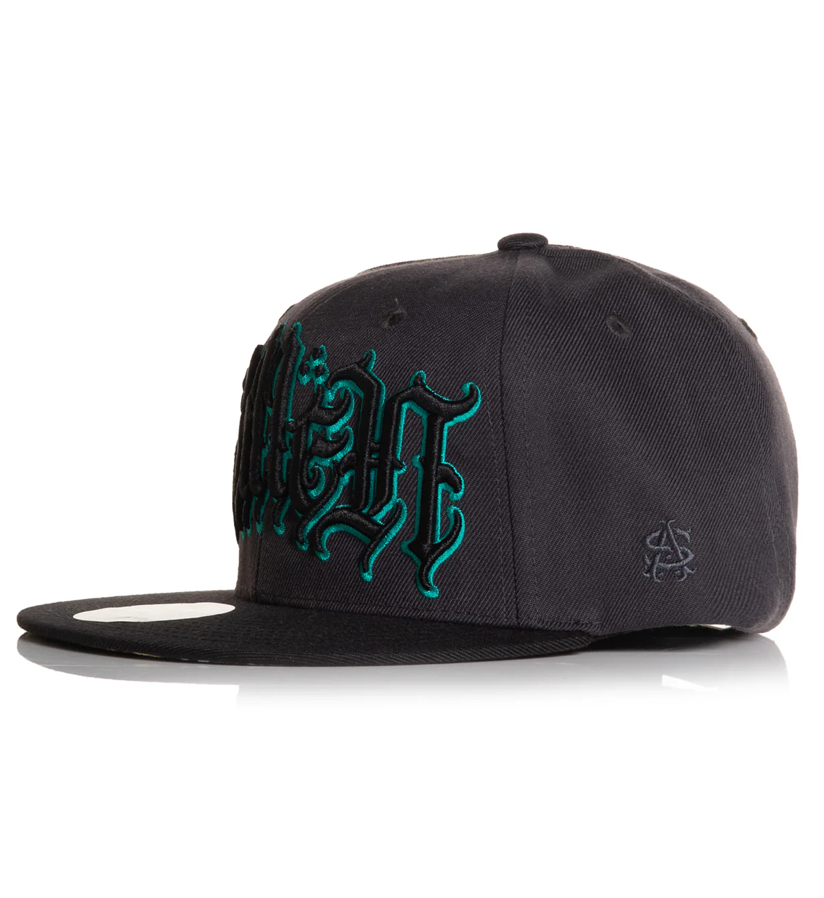 Présentation de la casquette Snapback Muerta – Une casquette grise élégante avec un lettrage brodé en relief noir accentué d’un trait bleu vif. La visière noire ajoute un contraste sophistiqué, tandis que la sous-visière surprend avec un dessin coloré du Jour des Morts.