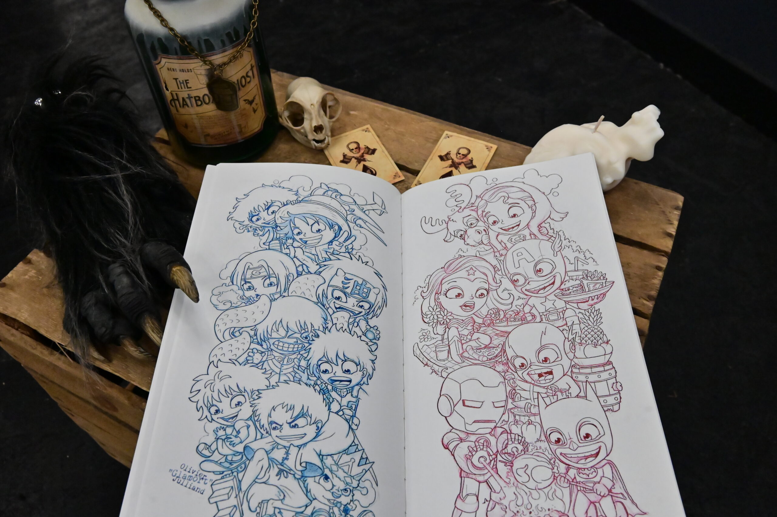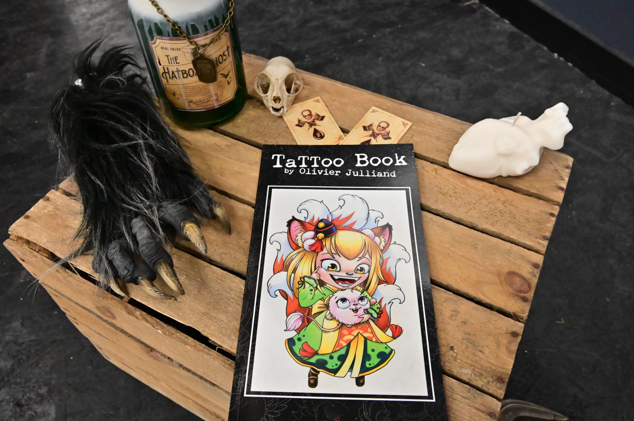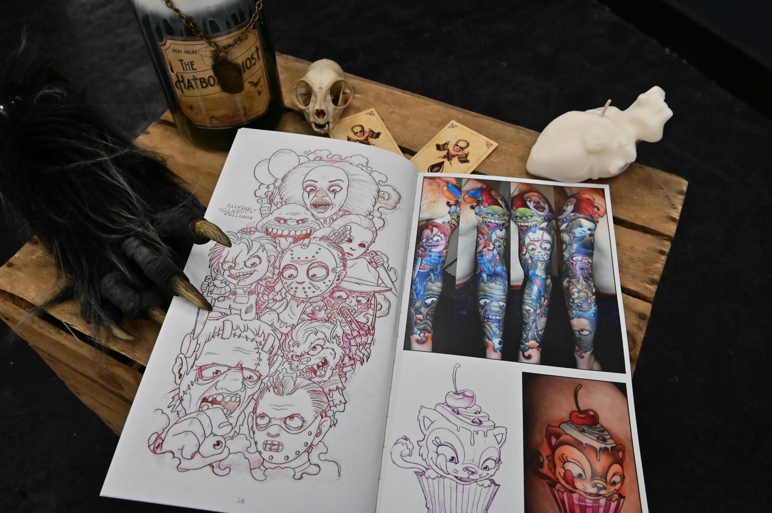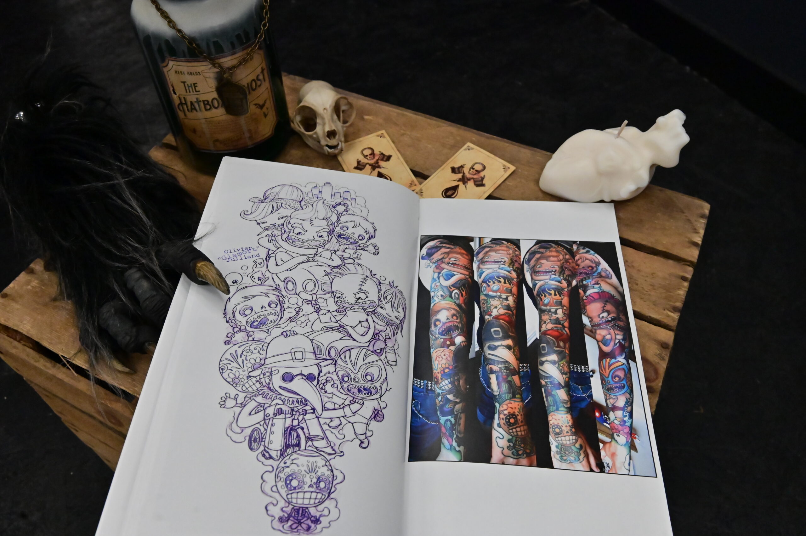 28.44Un recueil de tatouages réalisés par un artiste canadien, représentant par exemple une personne aux oreilles de renard, des oiseaux dans des fleurs, un enfant déguisé dans un costume de requin et une petite fille sur une balançoire entourée de monstres enjoués.