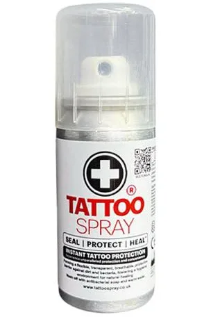 Tattoo Spray® est un film protecteur fabriqué au Royaume-Uni, conçu pour sceller, protéger et favoriser la cicatrisation de la peau fraîchement tatouée, offrant ainsi une protection instantanée. Il est certifié CE et UKCA, conforme au règlement REACH de l’UE et enregistré en tant que dispositif médical auprès de la MHRA et de l’EUDAMED, ce qui garantit sa sécurité et sa qualité.